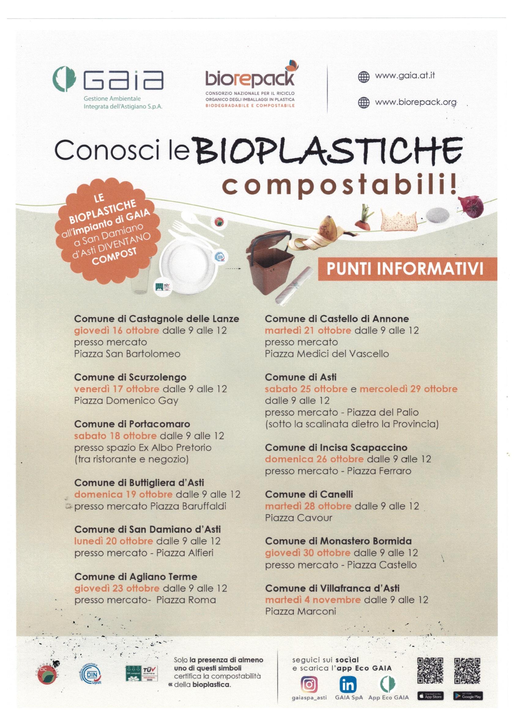 Si comunica che nei prossimi giorni, in diversi Comuni del territorio, saranno presenti punti informativi dedicati alle bioplastiche compostabili. Per date e sedi degli incontri consultare la locandina in allegato.