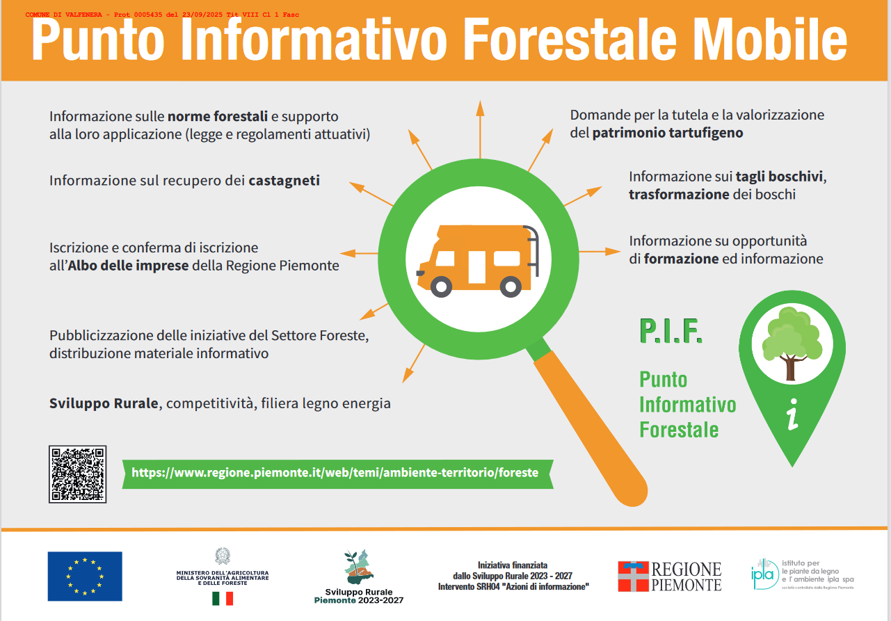 Giovedì 23 ottobre e giovedì 4 dicembre 2025 ritorna a Valfenera il "Punto Informativo Forestale Mobile" (PIFM): un servizio informativo forestale itinerante allestito su camper, che ha l'obiettivo di supportare e ampliare la rete informativa costituita dagli Sportelli Forestali e dai P.I.F. presenti sul nostro territorio.