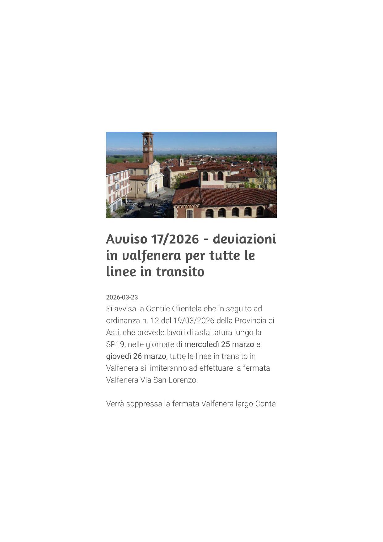 Si avvisa che nelle giornate di mercoledì 25 marzo e giovedì 26 marzo tutte le linee di trasporto pubblico in transito in Valfenera si limiteranno ad effettuare la fermata Via San Lorenzo. Verrà soppressa la fermata Valfenera largo Conte Quirico.